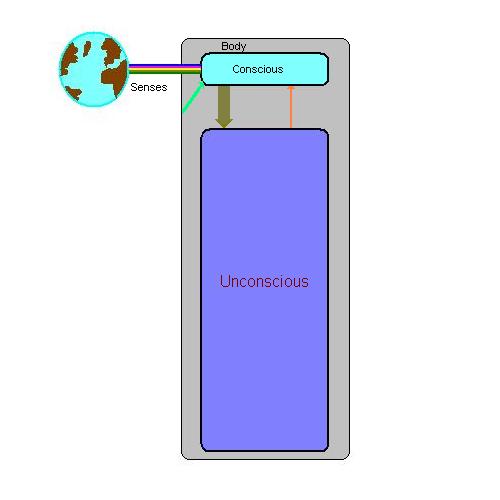 The five multicolored lines going from the globe into the cyan rectangle represent the information coming from the 5 senses entering the conscious mind.  The aqua line, going upwards diagonally from the body's border to the conscious mind represents the "internal" or "body" sense that we have.  For instance, it is with the "body sense" that we feel the rush of adrenaline or panic attacks or the feeling of being queasy or dizzy.  This model gives the conscious mind "first crack" at looking at the "bit stream" of information before passing what it is sensing downwards to the unconscious mind. There is some feedback from the unconscious mind to the conscious mind, mostly via memory, but this model has the conscious mind doing most of the thinking that we do.   I have sized the rounded rectangles to reflect the current belief that the conscious mind harnesses about 7% of the full potential of the human mind, with geniuses like Einstein and Goethe attaining 10% of full capacity.
